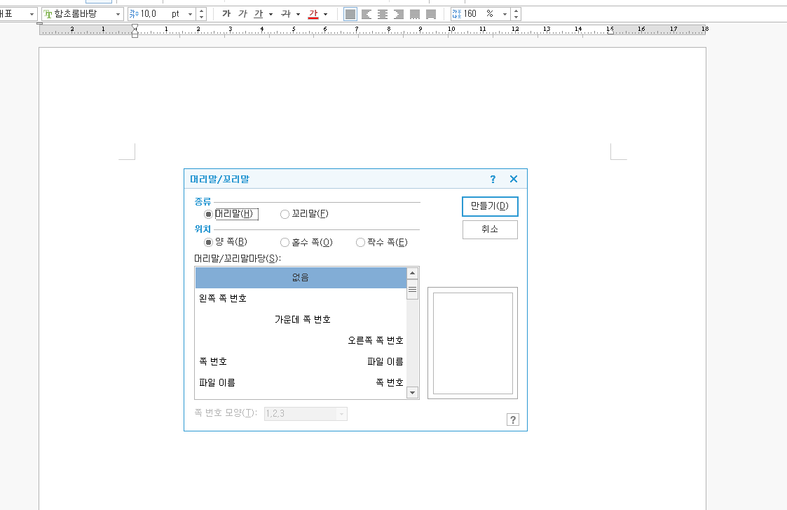 대개 "없음"을 선택하는 경우는 직접 쪽 번호를 기입하시거나, 문자가 삽입된 쪽 번호를 기입하실 때 사용하시는 거고, 그냥 자동으로 숫자만 따라오게 할 때는, 왼쪽/가운데/오른쪽 쪽 번호 및 기타 카테고리를 선택하시면 됩니다. 저희는 꼬리말, 우선 가운데 쪽 번호를 골라보겠습니다.