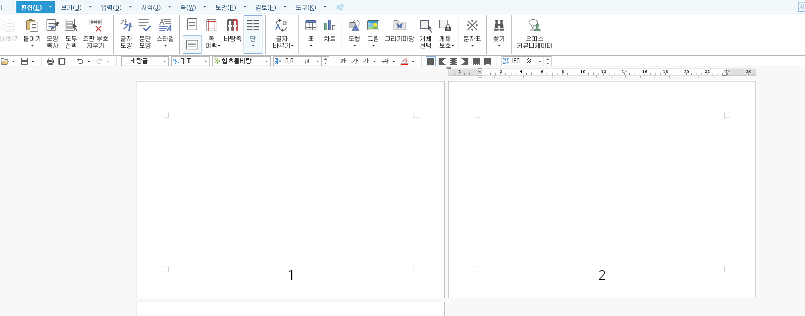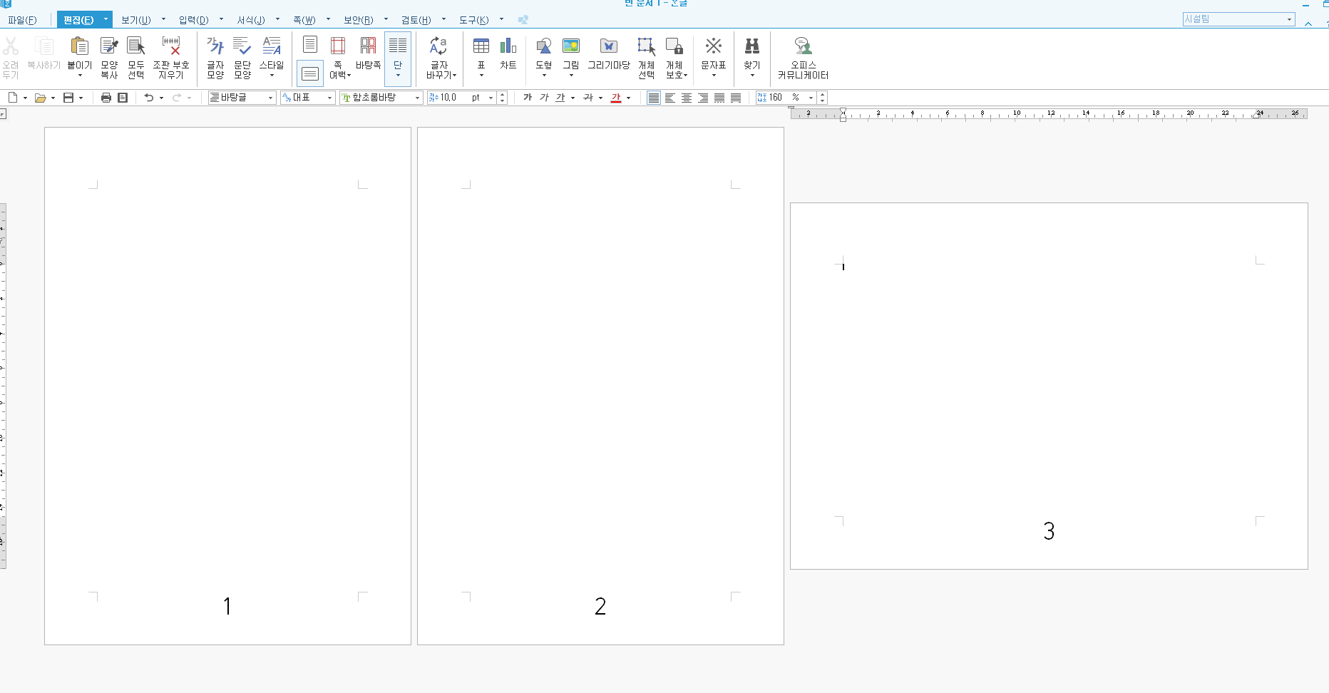 여기 꼬리말 가운데 쪽 번호가 새겨진 1, 2 페이지가 있습니다. 여기서 이제 1, 2와는 정말 새로운 3페이지를 만들어 보겠습니다.