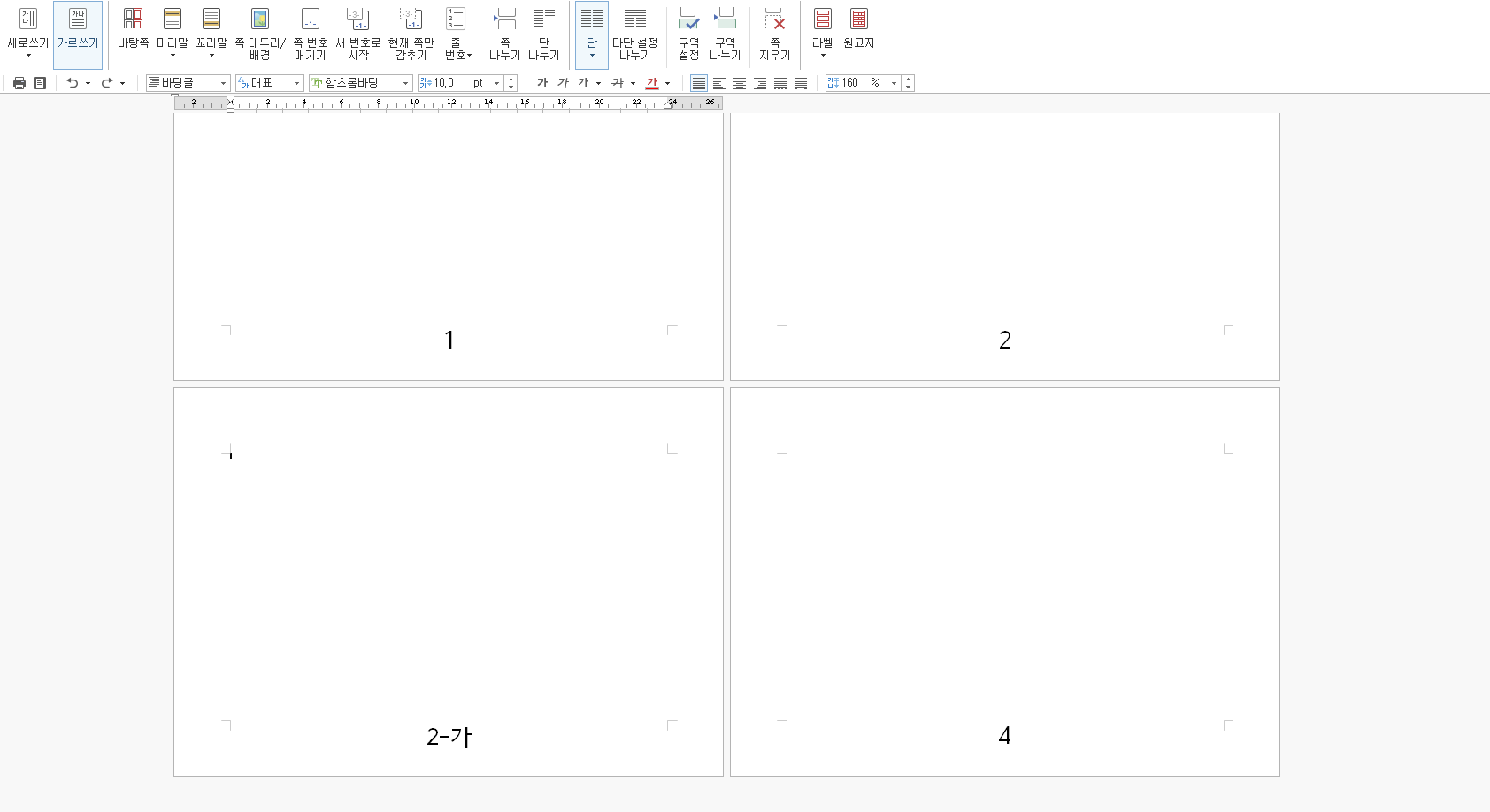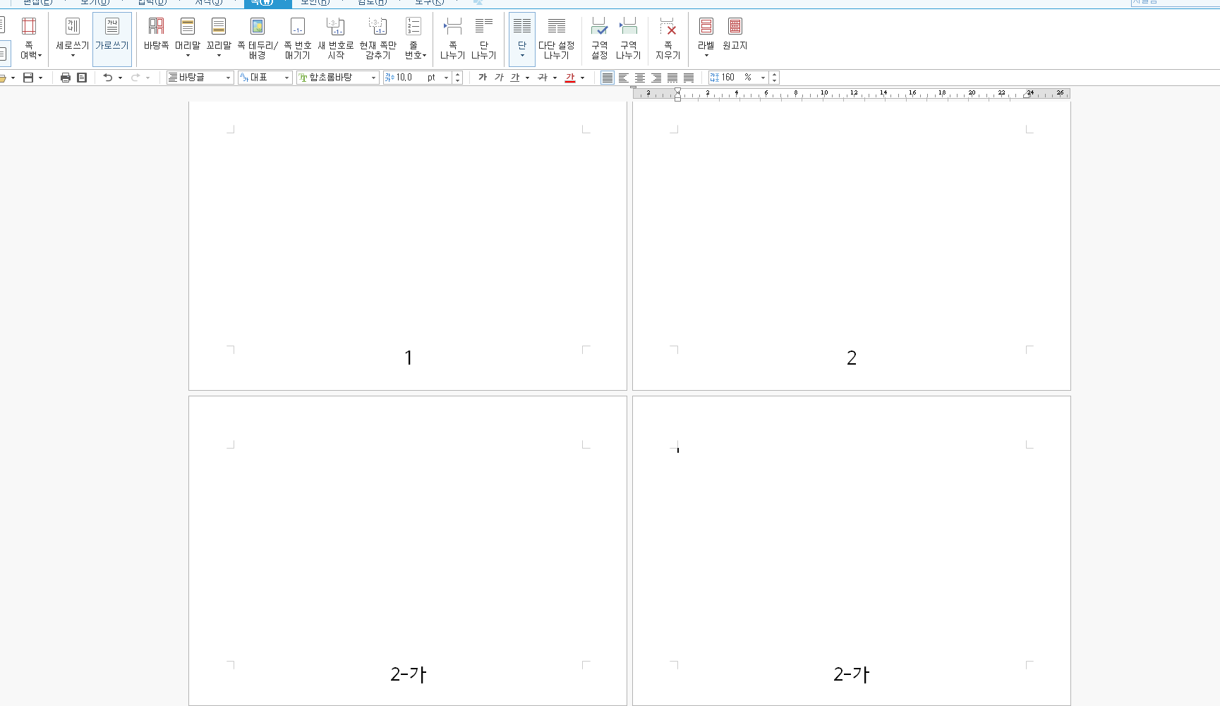 그럼 아까와 똑같이 2-가 페이지의 양식을 그대로 가져온 상태로 새 페이지가 정말 분리됩니다. 여기서 다시 Ctrl + N +H를 사용해 가운데 쪽 번호를 만들어주면 4가 기록되죠. 하지만 저희가 필요한 건 4가 아닌 3이기 때문에 이것을 바꿔줄 작업이 필요합니다.