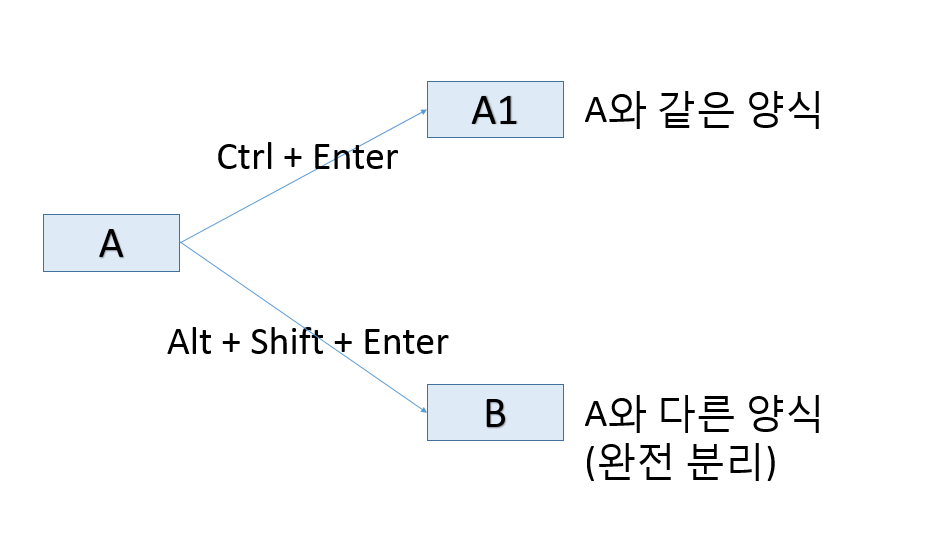 여기서 변화를 주는 것은 Alt + Shift + Enter인데요, 저는 이것을 "완전 분리"라고 배웠습니다. 이 완전 분리란 A의 양식을 우선은 가져오되, A와는 별개의 독립된 양식을 가지는 것입니다.