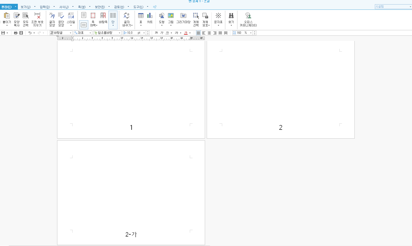 다시 3페이지로 돌아와서 Ctrl + N + H를 눌러주고 이번엔 "없음"을 골라 빈 양식을 만든 후, 입력 창에서 2-가를 입력하고 닫기를 눌러줍니다.