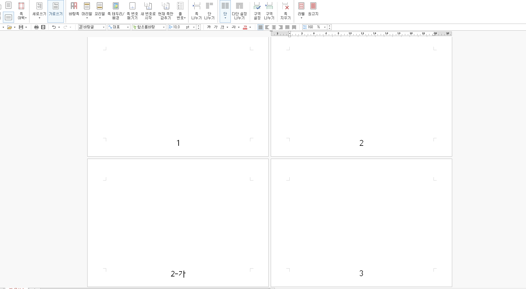 이처럼 페이지 정말 분리, Alt + Shift + Enter를 사용하면 정 말히 다른 양식을 사용해서 쪽 번호를 매길 수 있게 됩니다. 자 그럼 마지막으로 2-가를 만들었으니 다시 3페이지로 이어지는 쪽 번호를 만들어주어야겠죠? 2-가에서 다시 Alt + Shift + Enter를 눌러줍니다.