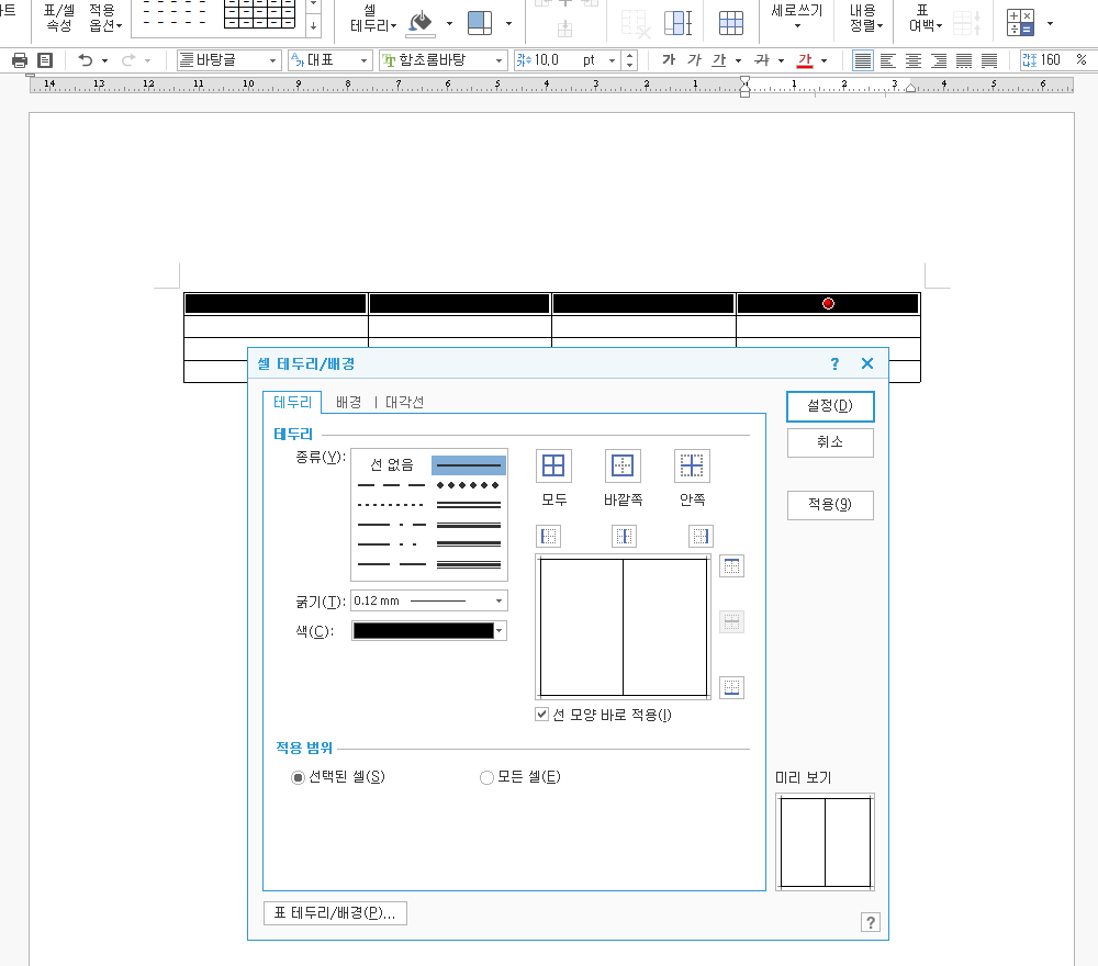 2. 한글 표에서 L키를 활용해 테두리 변경, 색깔 넣기, 대각선 등의 선 넣기