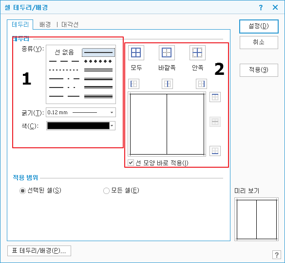 먼저 테두리 탭에서는 선의 종류를 고르거나 굵기 지정, 선의 색깔을 고르고 아래 미리 보기를 통해 출력해줍니다. 1번 네모 박스에서 먼저 종류/굵기/색을 골라준 후 2번 박스에서 어디에 지정해줄지 선택하시면 됩니다. 심화 팁을 하나 드리자면 현재 창에서 Alt 키를 꾹 눌러보시면 해당 기능에 해당하는 단축키가 뜨게 되니 익숙해지신다면 Alt 키를 이용해서 작업을 해보시는 것도 추천드립니다. 업무의 속도가 단축되고 마우스를 일일이 움직여줘야 하는 작은 귀찮음을 해결할 수 있습니다.