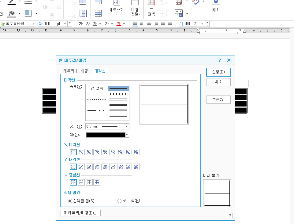 마지막으로 대각선 탭입니다. 1번 테두리 탭과 비슷한 탭입니다. 대각선의 종류가 정말 많은데 그중에서 필요한 것으로 골라서 넣어주시면 됩니다.