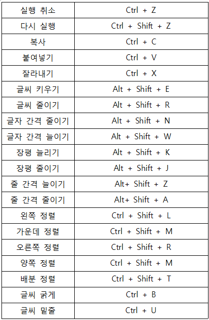 6. 문장 왼쪽 정렬 : Ctrl + Shift + L, 가운데 정렬 : Ctrl + Shift + C, 오른쪽 정렬 : Ctrl + Shift + R, 문장 양쪽 정렬 : Ctrl + Shift + M, 배분 정렬 Ctrl + Shift + T