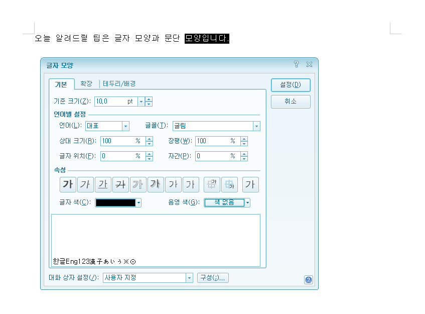 먼저 기본 탭에서는 글자의 크기, 그리고 언어의 글꼴, 장평, 자간 등을 설정할 수 있습니다. 지난 포스트에서 알려드린 단축키들이 이 곳에서도 설정이 가능한 것이죠. 특히 속성 부분을 살펴보시면, 글자를 진하게 하거나 음영을 넣거나 혹은 취소선, 언더라인 등의 설정과 글자 색, 음영 색들을 고르고 밑에 미리 출력해주는 화면을 통해 확인할 수 있습니다.
