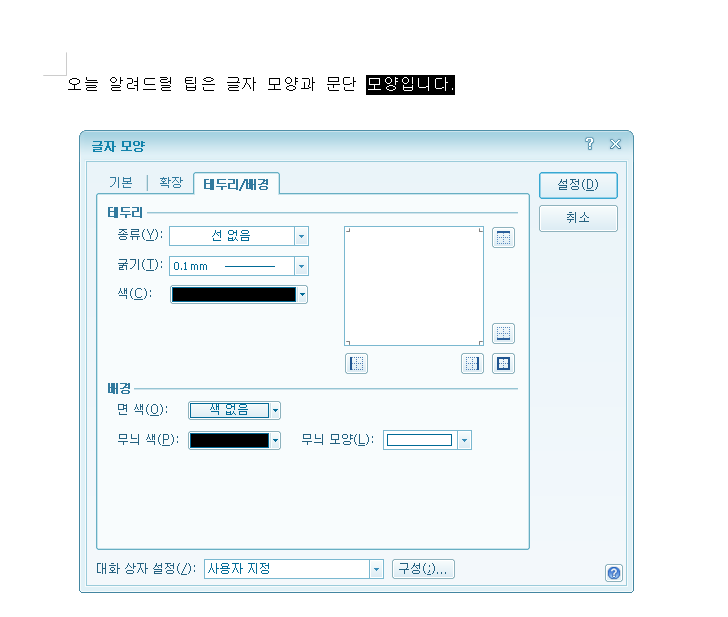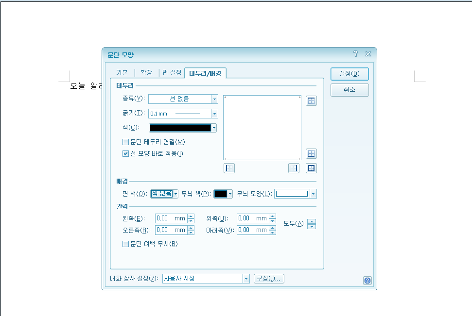마지막으로 테두리/배경 탭입니다. 테두리/배경 탭에서는 말 그대로 태두리와 배경색을 지정해 줄 수 있습니다. 이 부분은 다음에 나올 문단 모양의 색깔 탭과 비슷한데, 이 부분도 사실 자주 쓰이지는 않는 것 같습니다(개인적인 의견입니다).