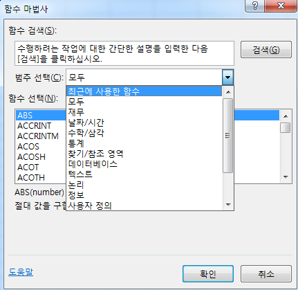 이 함수 마법사를 사용하면 왼쪽의 범주 선택을 통해
