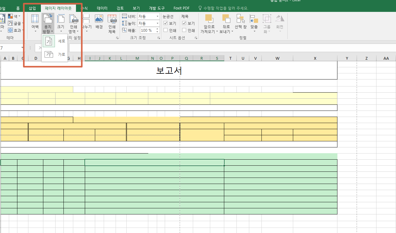마지막으로 페이지 레이아웃에서 용지 방향을 정하는 방법입니다. 아래한글의 용지 방향과 똑같은 설정인데요. 지금 보고서 같은 경우엔 가로로 길기 때문에 용지 방향을 가로로 설정해주는 것이 좋습니다.