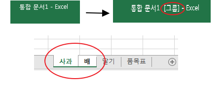 시트 확인이 끝나셨으면 다음 할 일은 간단합니다. 사과 시트에서 컨트롤을 꾹 누른 상태에서 배 시트를 눌러보세요. 그럼 시트가 두 개가 동시에 선택된 것을 확인하실 수 있습니다. 또한 위의 제목도 [그룹]으로 바뀐 것을 확인하실 수 있습니다.