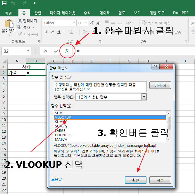 그다음 가격표 옆의 B2셀을 클릭하고, 오리엔테이션에서 말씀드린 것처럼 함수 마법사에서 VLOOKUP을 찾아주세요.