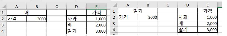 먼저 사과, 배, 딸기의 가격표에 대한 간단한 보고서와 그 품목들의 가격을 나타내는 품목 시트가 있습니다. 단순히 이 품목 시트의 값들을 보고 각 과일 시트에서 일일이 입력해주시는 것도 하나의 방법이 될 수 있겠습니다만 시트와 품목의 양이 많다면 일일이 입력하는 것조차 시간이 너무 많이 쓰입니다. 특히 만에 하나 눈으로 보고 하다가 잘 못 입력하는 경우도 생긴답니다.